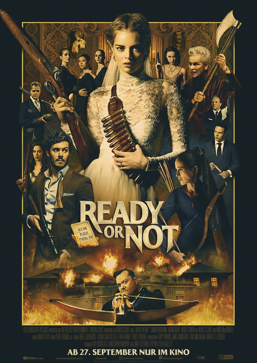 Mit der Handlung selbst ist es ein ähnliches auf und ab. Diese überrascht mit derben Gewaltspitzen und ab und an traut man sich sogar was, nur um im nächsten Moment wieder ein Cliché zu bedienen. Dazu kommen noch die milden Twists, die eigentlich keine sind, da sie viel zu schlampig und auffällig vorbereitet werden. Die Regiearbeit der beiden Regisseure benötigt ebenso noch einiges an Feinschliff, was sich aber im Filmverlauf stetig bessert. Dann weiß man das tolle Setdesign zu nutzen und der Szenerie Raum zum Atmen zu lassen. Außerdem wird nach der schwachen Einführung ordentlich an der Spannungsschraube gedreht. Der schwarzhumorige Unterton des Films ist jedoch Geschmackssache. So mancher Kinogänger wird von den Gags überzeugt sein, bei anderen schüren diese den Hass gegenüber der reichen Familie. Eine Win-Win-Situation also. Damit mausert sich der Film im zweiten und speziell im letzten Drittel und zieht sein Publikum überraschend in seinen Bann. Also sollte man sich von der drögen Einführung nicht abschrecken lassen und dem Comedy-Thriller eine Chance geben. Fans von ‚You’re Next‘, dem Scream-Franchise oder ‚Cabin in the Woods‘ sei ‚Ready or Not‘ dringend empfohlen!